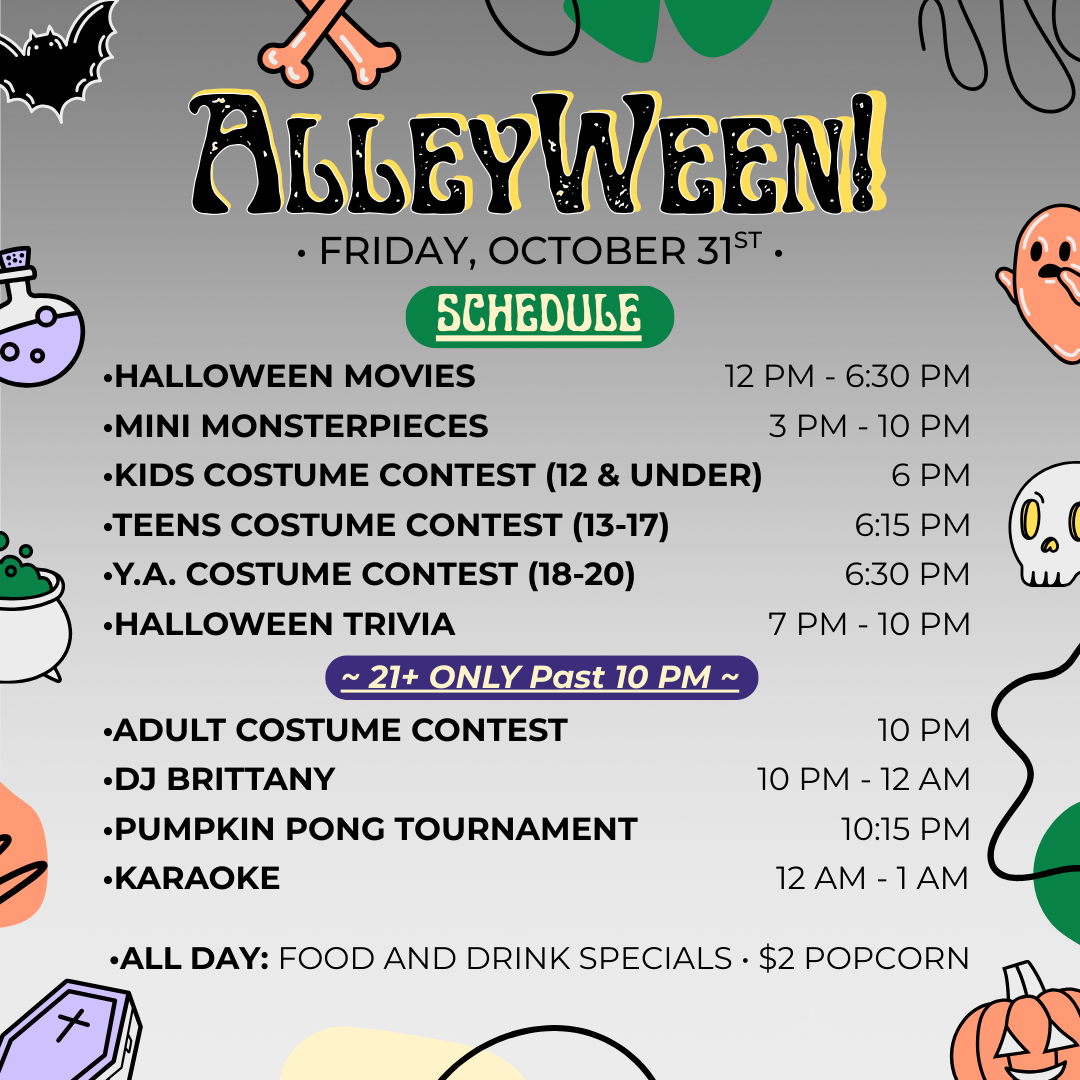Alleyween! come enjoy the fun this halloween! Sign up for Alleyween Events here! Questions? Give us a call! 636-388-8329
